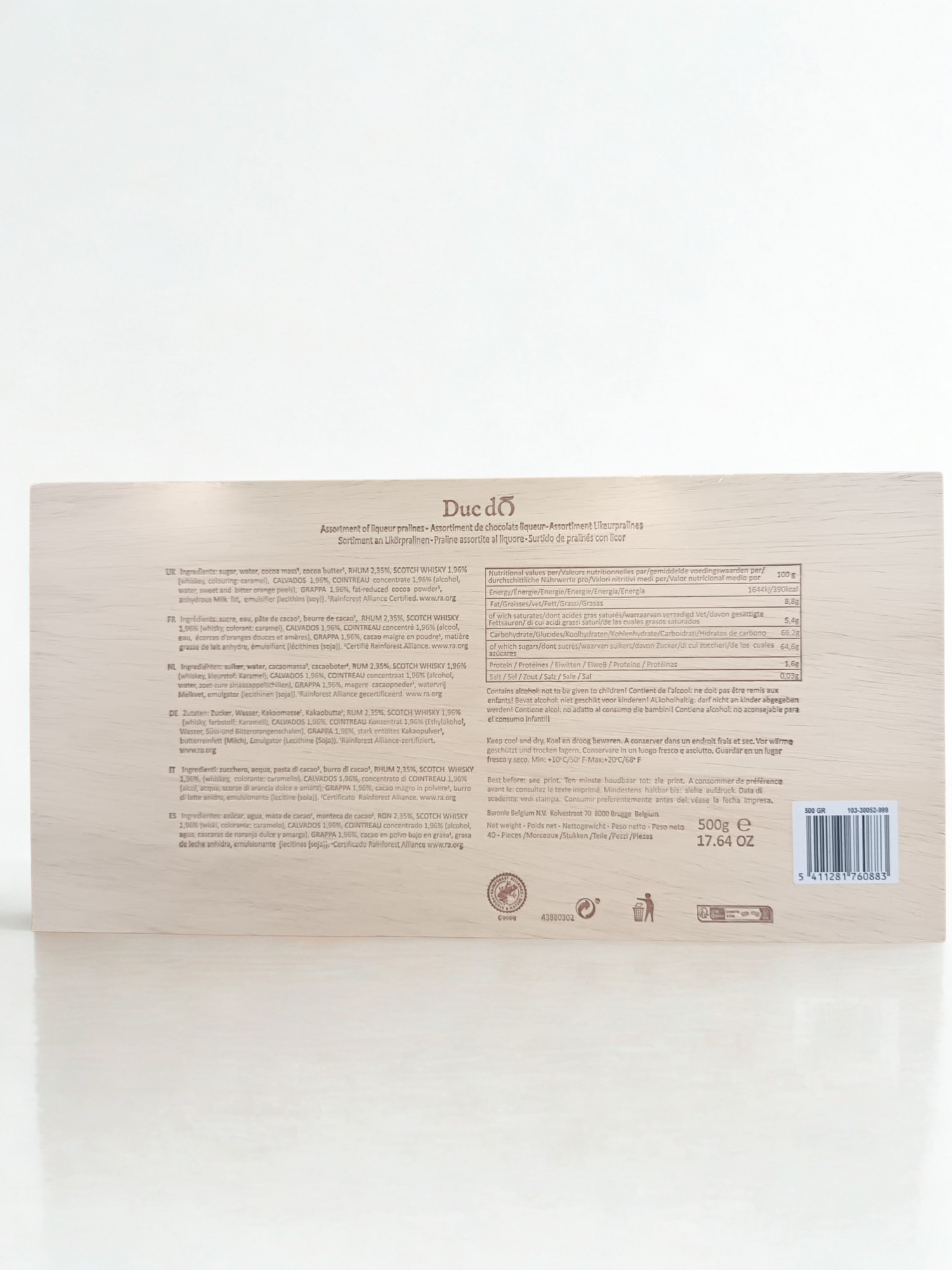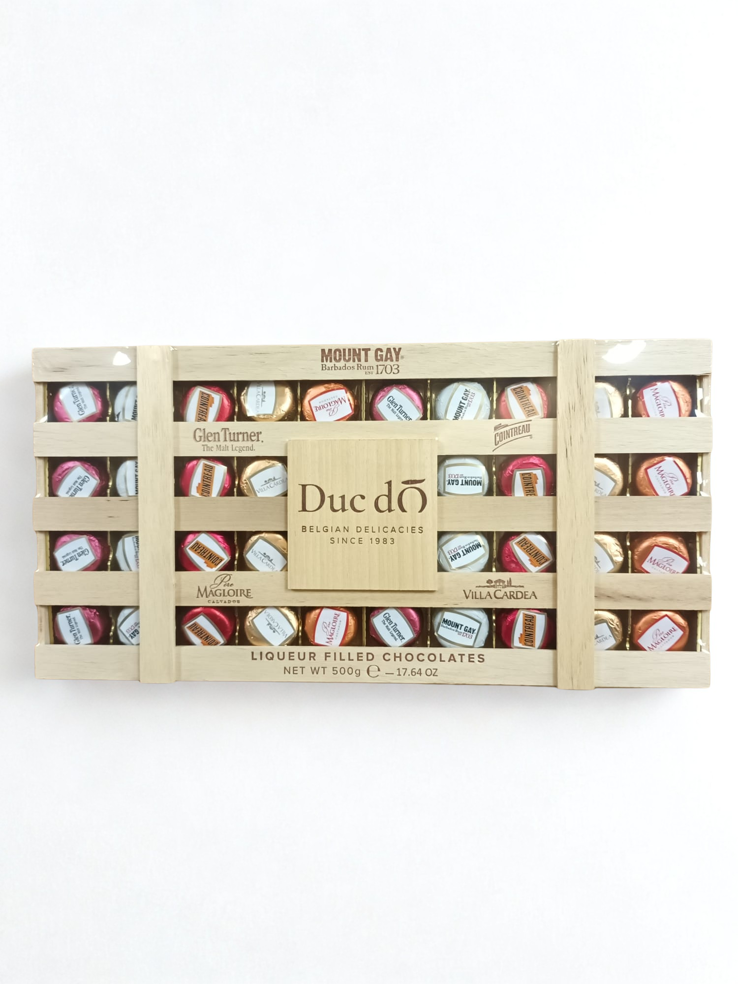 Cioccolatini alcolici assortiti con ripieno liquido, in cofanetto di legno.
